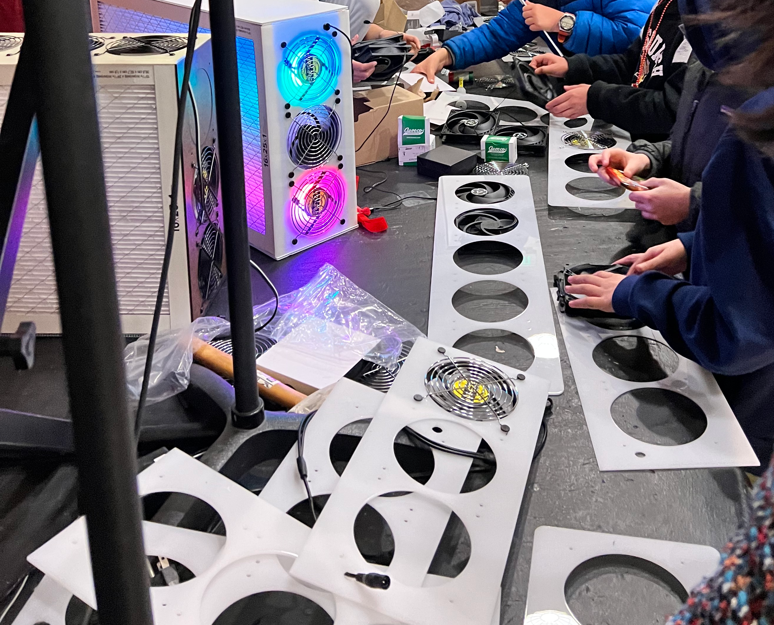 CleanAirKits started from Corsi Rosenthal box STEM lessons for our kids elementary, inspired in turn by experiments within the twitter clean air community. We split each class into 3 groups building box fan CR cube, box fan CR pyramid and sandwiched computer fan CR Boxes. These mixed builds taught broad lessons to us, the teachers and the kids: kids felt the makeshift power of motley-taped CR boxes under various filter thicknesses/counts, teachers greatly appreciated the quieting refinements from computer fans, and kids loved the LED lights.